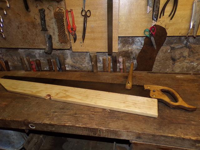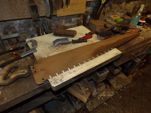 Trouvée en brocante, nous ne connaissons pas la marque ni la date de fabrication de cette scie. Très rouillée, mais non aiguisée, sa poignée en contre-plaquée ne semble pas d'origine. La restauration commence par le "dérouillage" de la lame. Après avoir appliqué dessus un peu de vinaigre blanc, la lame est polie à la brosse métallique et la pierre à eau.
