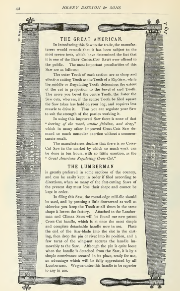 Notre scie, longue d'1m20 avec poignée (1m de denture) possède une denture "Great American" parfois aussi appelée Crown Tooth. D'après le manuel d'entretien Disston and Son's de 1874, il s'agit "de la meilleure scie transversale jamais proposée au public", mais doit-on croire sur parole un vendeur de scie ? Quoiqu'il en soit, la Great american est une scie astucieuse. Le motif des dents forme une sorte de couronne. Les dents extérieures de la couronne sont les dents de coupe. La dent centrale, appelée dent de régulation, donne la vitesse de coupe en fonction de son angulation. Plus son angle est grand, plus la coupe sera rapide mais demandera en contrepartie plus de force.