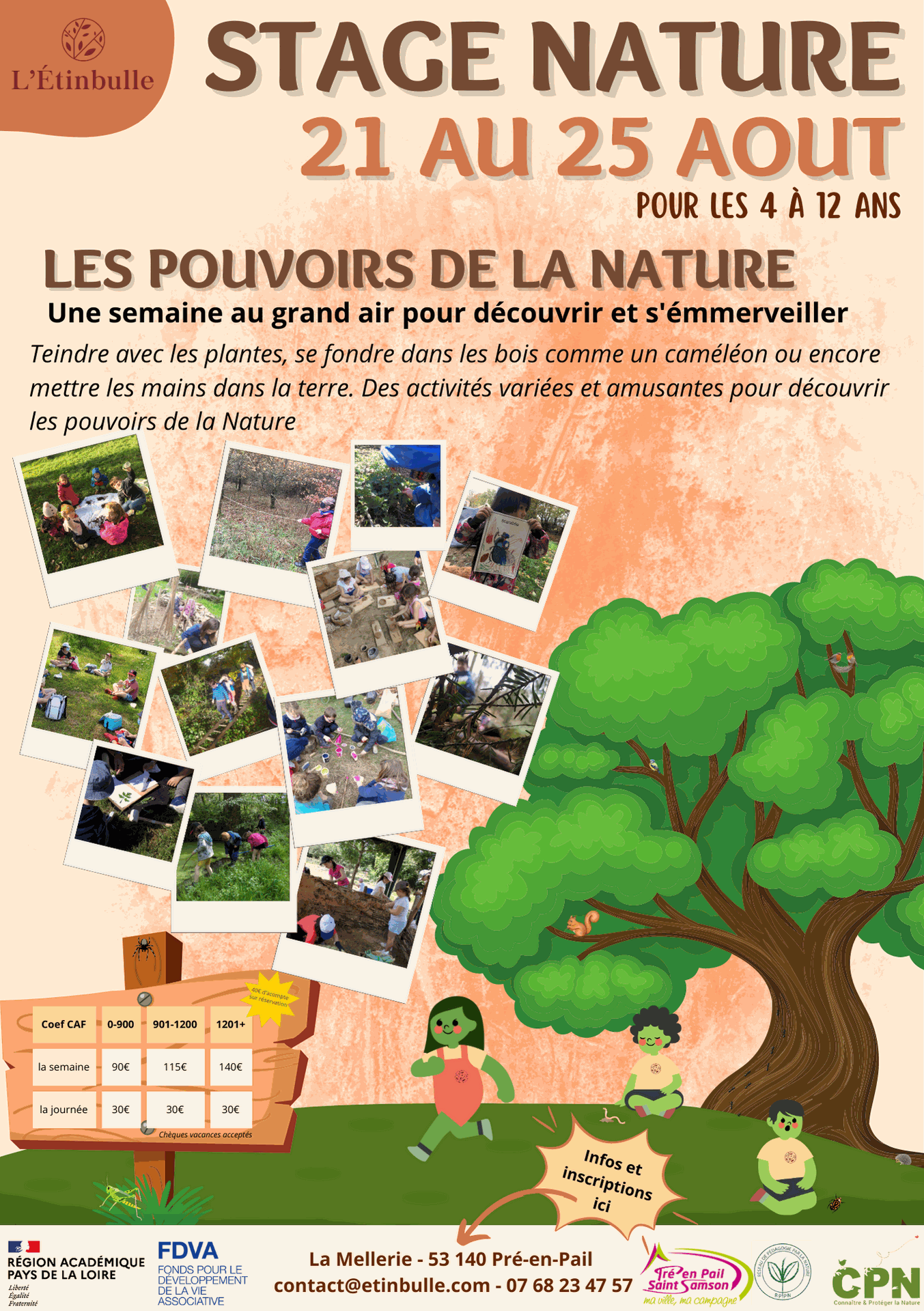Le stage nature se déroule du 21 au 25 août, à la journée sans hébergement. Les enfants peuvent participer à la semaine ou à la journée sur réservation uniquement.